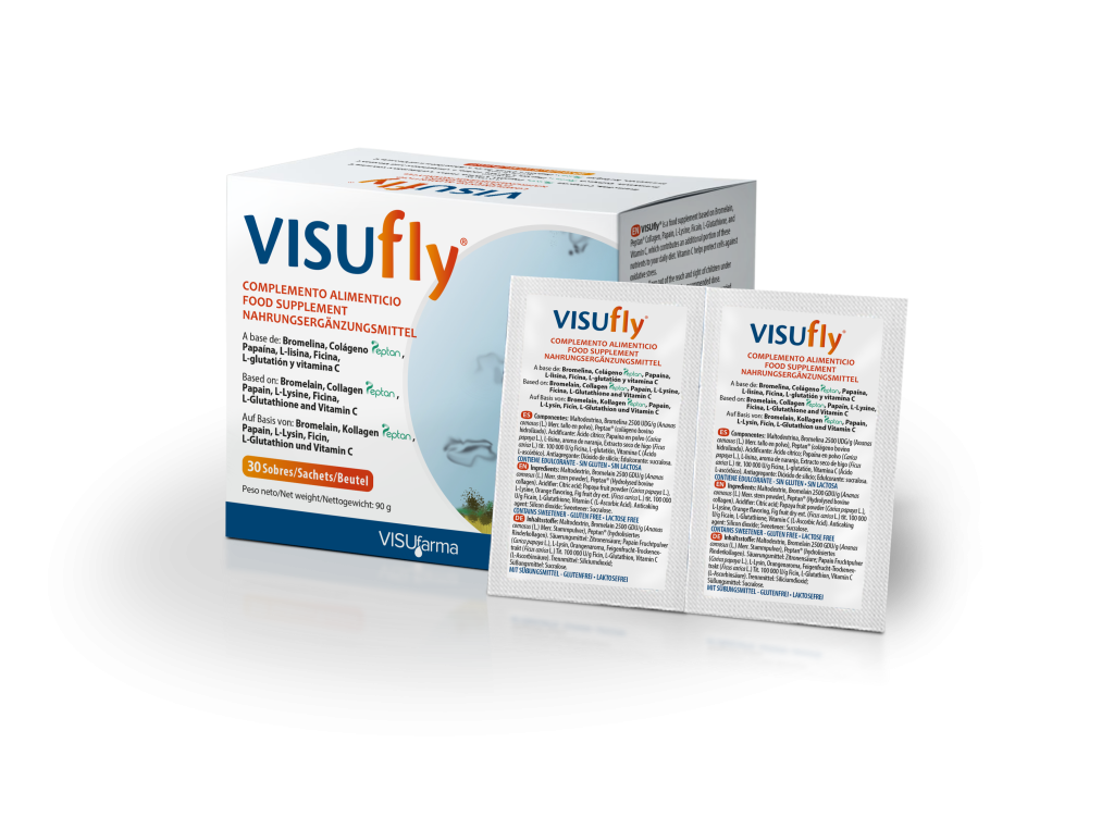 VISUfarma are launching VISUfly® sachets: a dietary supplement with a unique blend of natural enzymes, antioxidants, and collagen – whose key ingredients help provide support for those with vitreous floaters (myodesopsia).1,2*